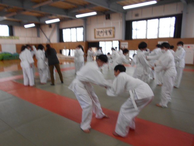 1組保健体育は柔道が始まりました。まずは相手と組み合い、相手の体勢を崩す練習です。