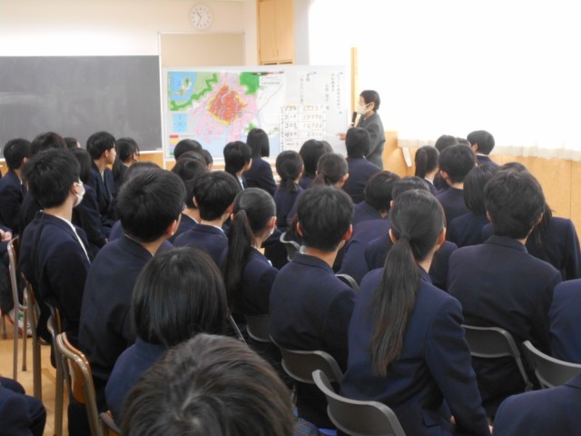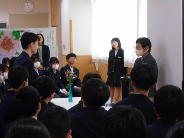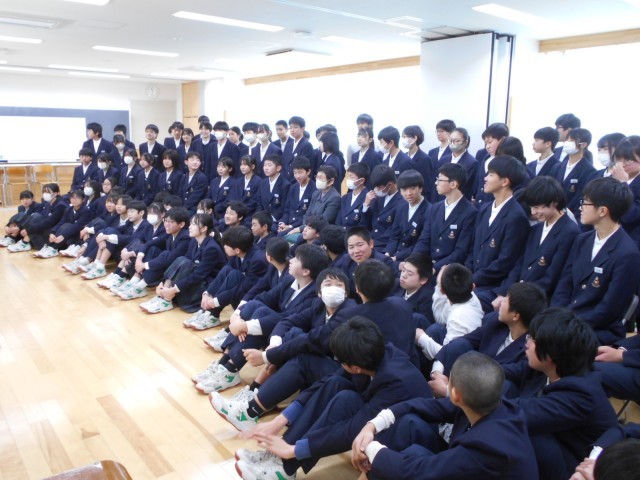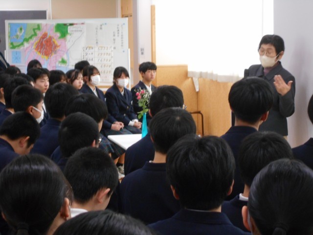 2年生は修学旅行で広島を訪れ、平和学習をします。その事前学習として、広島被爆者援護会理事長の石原智子さんを講師にお招きし、平和講演会「伝えたい広島の心」を行いました。胎内被爆者である石原さんのお母様の体験談等をお聞きし、平和を願って私たち自身にできることとは、健康であること、感謝の気持ちを忘れずに日々を楽しく生きること等であることを教えていただきました。
