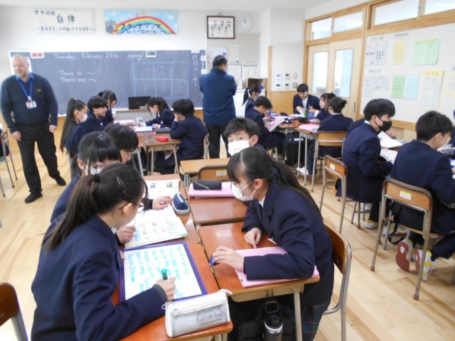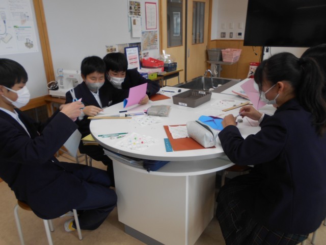 1組家庭科では、色画用紙を切って、完成した刺し子を飾るための枠をつくりました。
