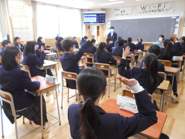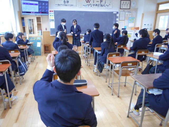 6限目にオンライン臨時生徒総会を行いました。議題は6つの専門委員会を4つに再編することで、仕事の少ない委員会を統合し、委員会活動を活性化しようというものです。生徒会執行部がオンラインで議題説明し、各学級ごとに賛成・反対の決をとりました。結果は賛成多数で、令和7年4月から4つの専門委員会で活動することに決定しました。