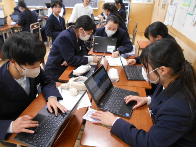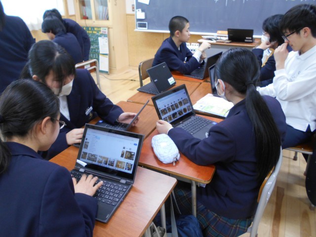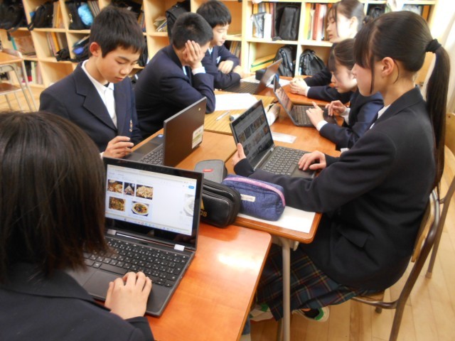 2年生は5月の修学旅行の広島市内班別学習の準備を進めています。今日は昼食場所を決める話合いを行いました。各自、クロムブックを使って、有名なお好み焼き屋さん等を調べていました。