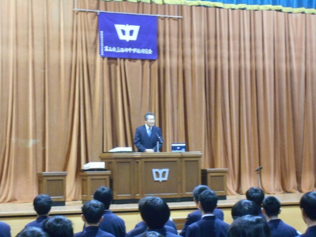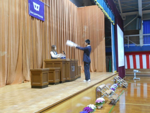 同窓会入会式と育成会記念品授与式が行われ、同窓会からは印鑑、育成会から卒業証書ホルダーが代表生徒に送られました。
