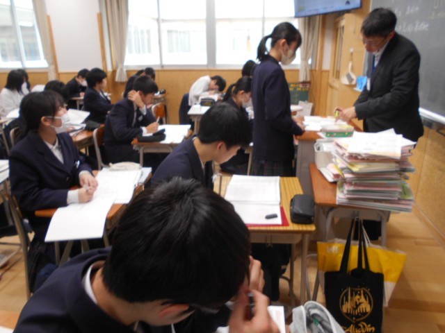 1組数学はワークの残りを仕上げ、先生に提出する時間でした。これで2年生での学習範囲は終了ですが、すぐに3年生の学習が始まるので、自主的に復習するなどしましょう。