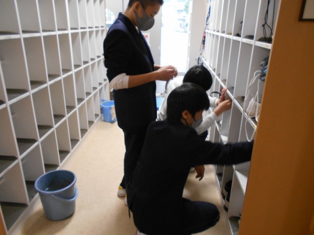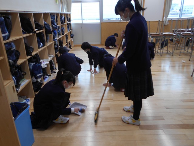 次に使う新1年生が気持ちよく使えるように、1年教室や廊下、生徒玄関等、1年間使用してきた場所を念入りに清掃しました。