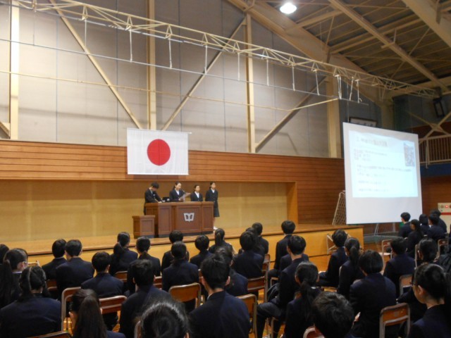 2年生の4名が2/16(土)に県民フォーラムで発表した「イタイイタイ病と共に生きた富山と今の私たち」を、全校生徒の前でも発表しました。