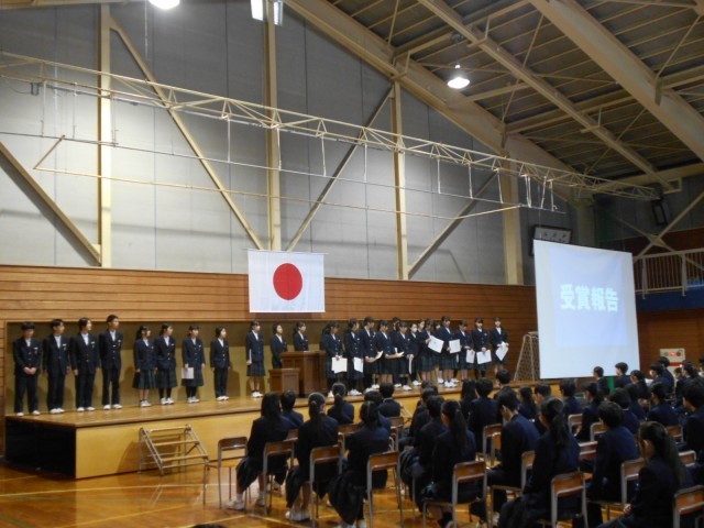 受賞報告では、書き初め大会やアンサンブルコンテスト等の受賞が紹介されました。