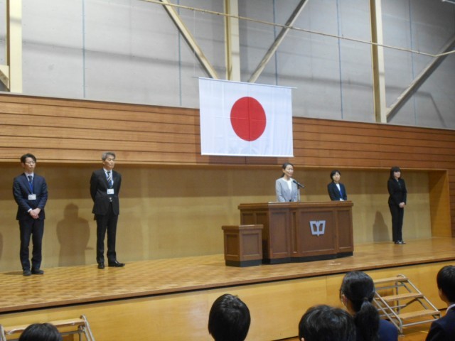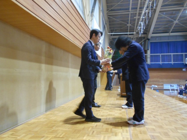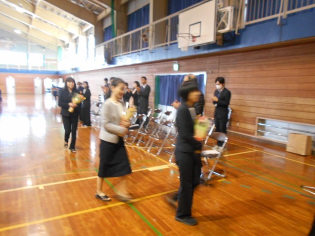 退任式・離任式を行い、4名の教職員が退任、2名の教職員が離任します。教職員からの挨拶の後、生徒から花束が手渡されました。
