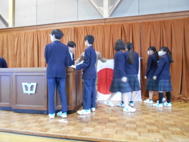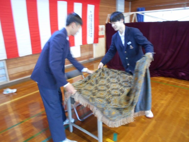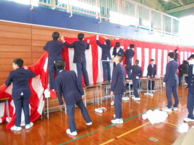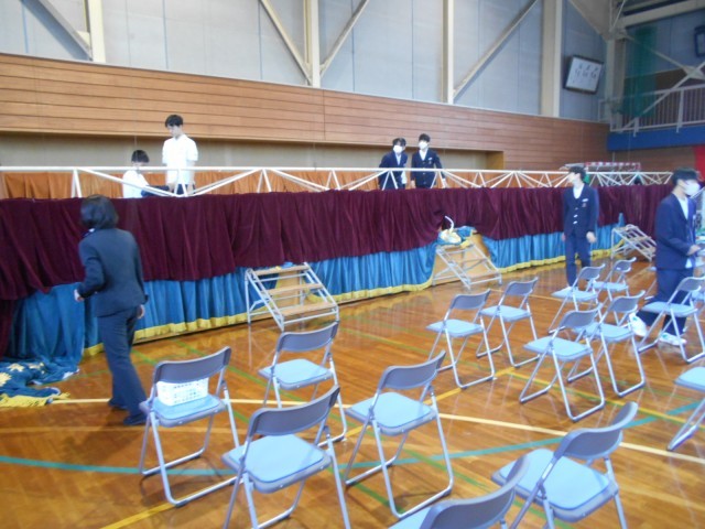 明日の入学式の式場準備を新3年生が行いました。3月の卒業式の式場準備の経験を生かし、1時間で準備してくれました。3年生に感謝です。