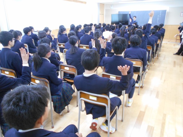 2学年は学年集会を行い、学年主任の先生や生徒指導主事の先生から、2年生へ進級した自覚をもつよう、お話しがありました。