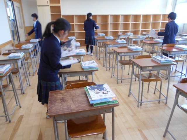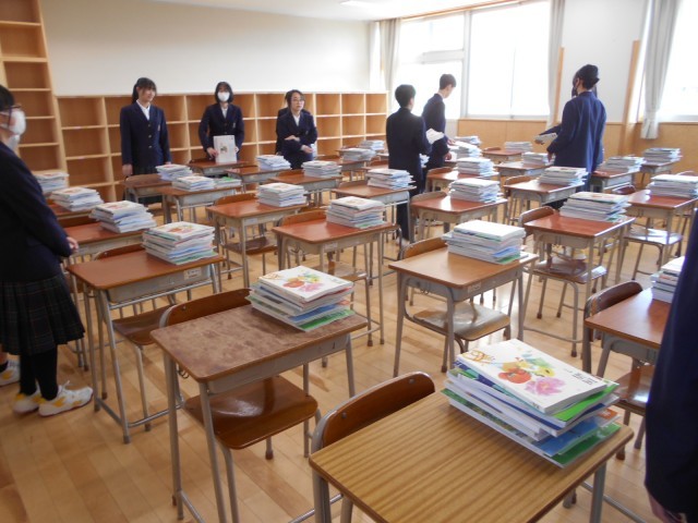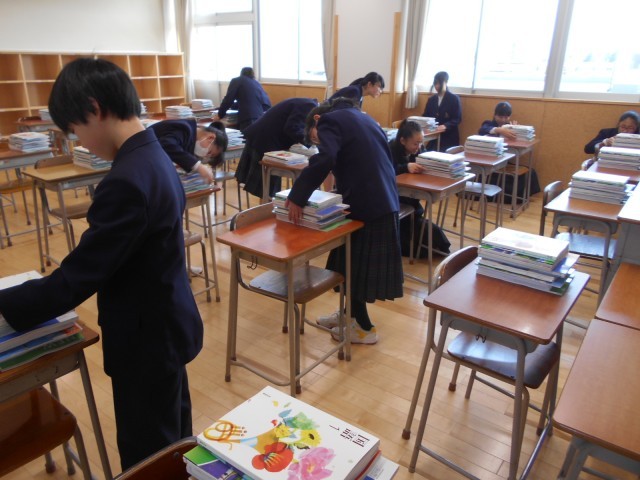放課後、新2年生が新入生の入る教室の飾り付け、机上への教科書配布等を行いました。これで明日の準備がほぼ終了。新入生が来るのを待つのみです。