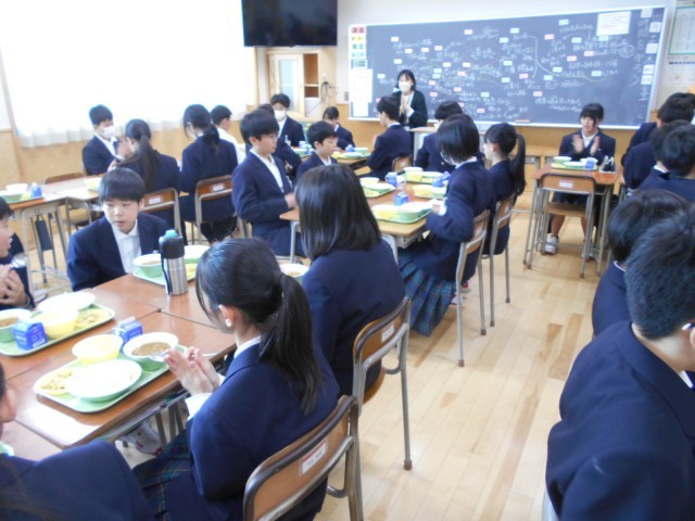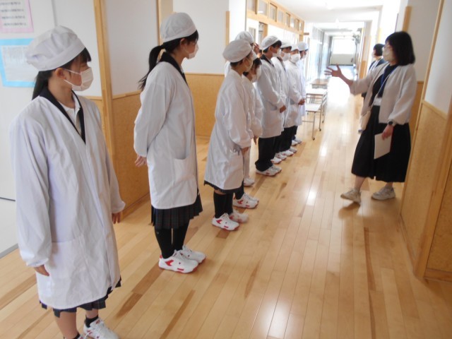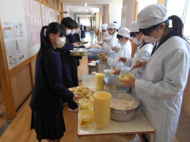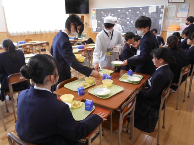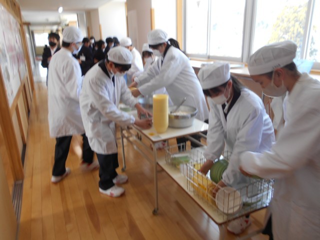 写真クリックして上から、①当番が整列して点検、②配膳台に食器等を準備、③当番がごはんやおかずを盛り付け、④当番以外は着席して配膳を待ち、⑤準備が整ったらいただきます の様子です。(写真は1年3組)
