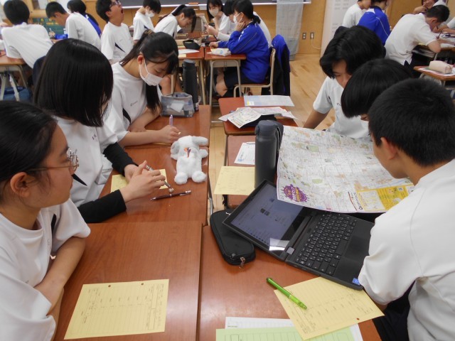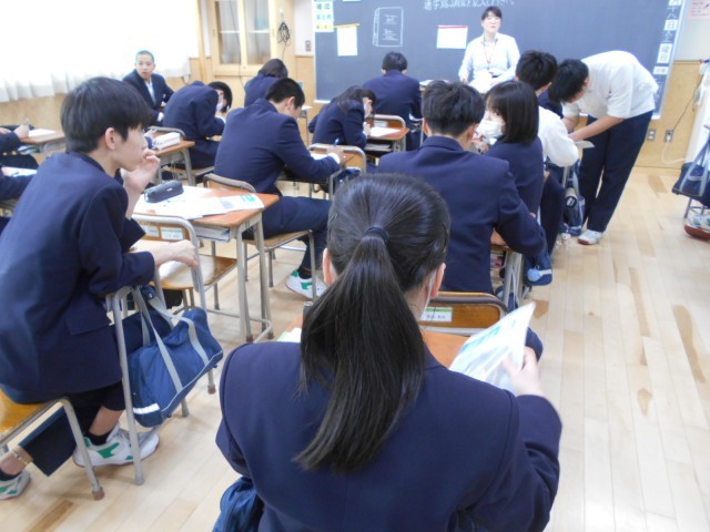 3年生は5、6限と歯科検診と並行して授業を行っていました。1、2組は学活で修学旅行の準備を、3組は数学の授業開きでした。