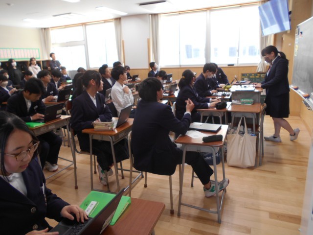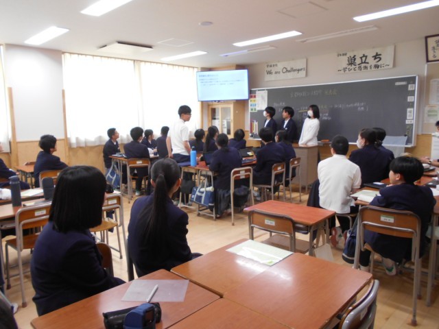 3学年は修学旅行の訪問先のプレゼンを作成し、説明する発表会を行いました。約1か月後に近付いた修学旅行への期待感がいっそう高まる発表会でした。