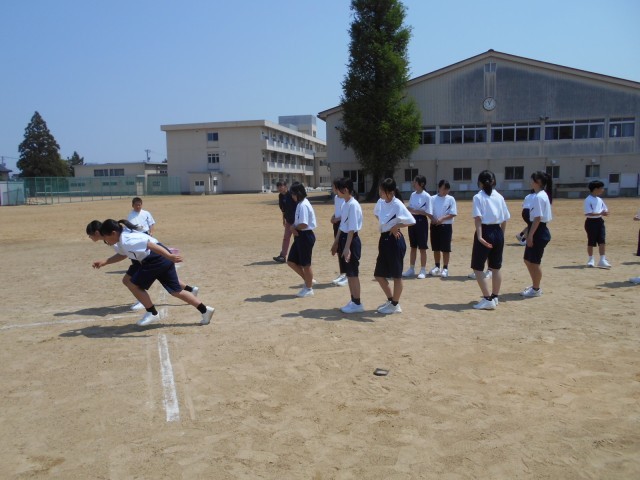 2組保健体育では、スポーツテストの50mタイム測定に向けて、クラウチングスタートの練習に取り組みました。スタンディングスタートよりも力強く踏み出せるので、タイムアップにつながります。がんばってマスターしましょう。