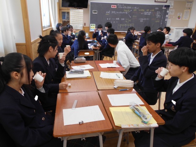 3組家庭科では、硬水、軟水、中軟水の飲み比べを行っていました。皆、さすがに飲み慣れた軟水をしっかりと当てていました。