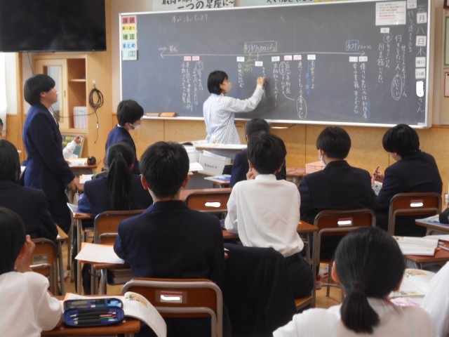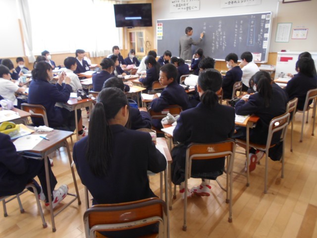 木曜4限は1年生の全クラスが一斉に道徳を行っています。3つのクラスを順に巡りながら見ていると、隣の人と気軽に意見を交換したり、手を挙げて自分の考えを堂々と発表したりする人が多い、素敵な学年だと思いました。ぜひ、これからも続けてください。