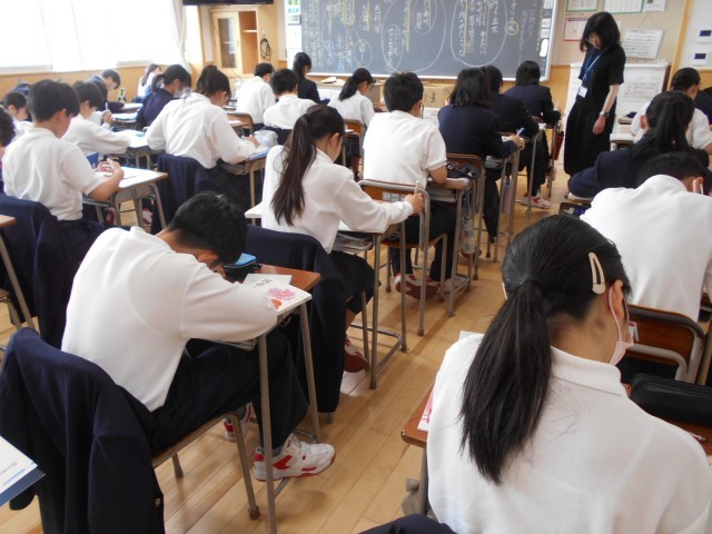3組国語では、「はじめての風」を学習し終えて、考えたことや思ったことをノートに10分間で作文することに挑戦しました。来週の中間考査でも作文が出題されるようです。