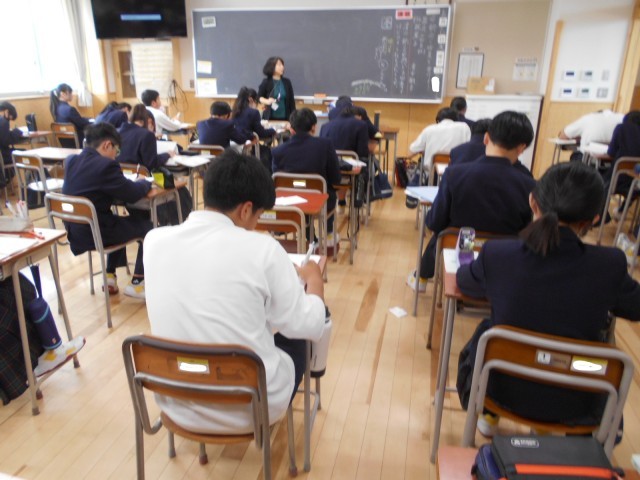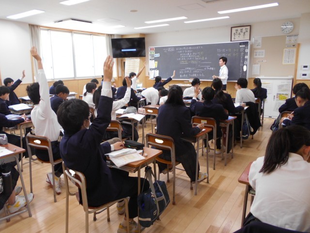 3組数学では、意欲的に問題に取り組む姿が見られました。出題された問題に対して、先生が「答えが言える人?」と問うと、多くの手が上がりました。