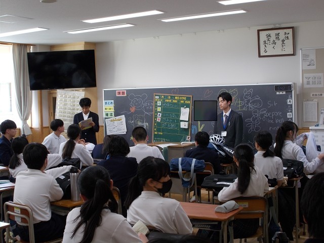 教育実習生は担当している学級で、朝学活と終学活を行っています。3年生を担当している実習生は3年生が修学旅行中のため、2年生の学級を担当しました。来週の連絡や一日の様子を生徒に伝えました。