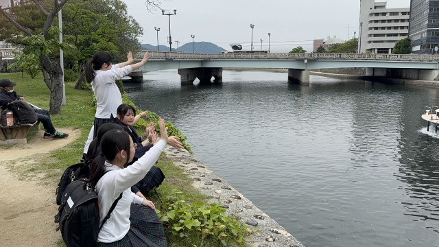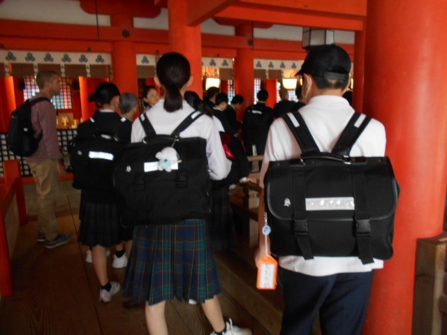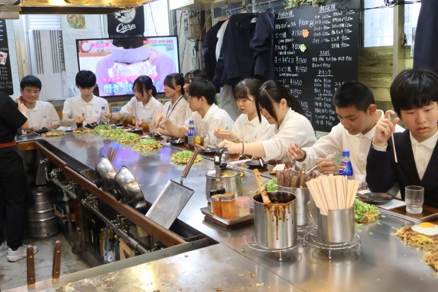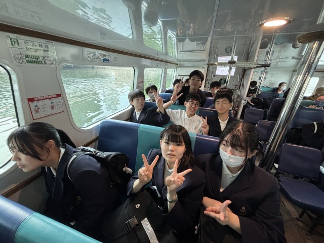広島の班別コースは、広島と、宮島に分かれて活動をしました。広電を利用するところや、原爆ドーム前の桟橋から世界遺産航路を利用するなどして宮島に向かいました。広島の班が船に手を降り、宮島班を見送るシーンがありました。広島班は、平和学習を課題として、護国神社や折り鶴タワーなどを見学しました。昼食は、お好み焼きでした。お好み焼きは、広島の復興に大きな力となったというので、本番の味を楽しみながら、お店の方に広島の復興のことやお好み焼きの由来等を聞きながら、楽しくいただいていました。