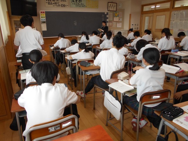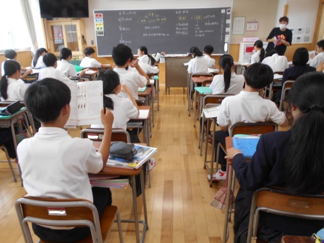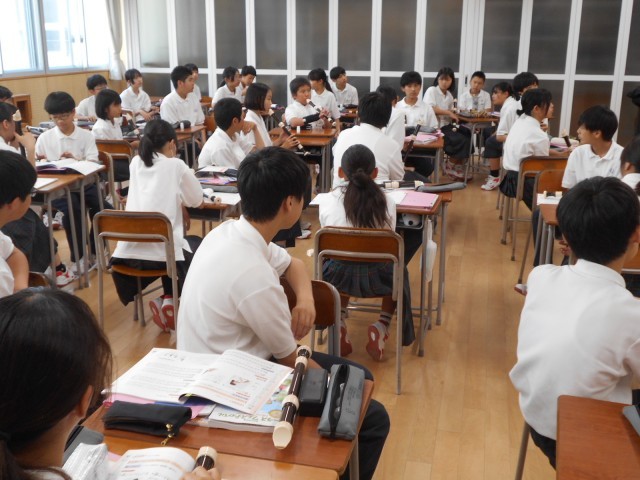 2組音楽では、男女ペアで順番にリコーダー演奏をしていました。演奏しているペアは頑張っていましたが、他の生徒も演奏者の方へ身体を向けて静かに聴き、演奏が終了したら拍手していました。とても素晴らしかったです。