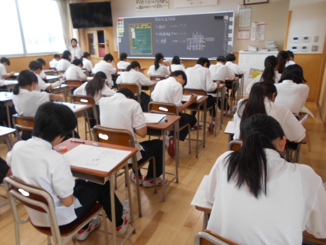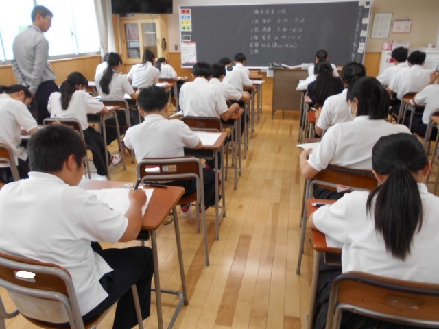 期末考査最終日の最後の教科に取り組んでいます。3日間で9教科のテストはどうでしたか? 日頃の授業を大切にしていきましょう。