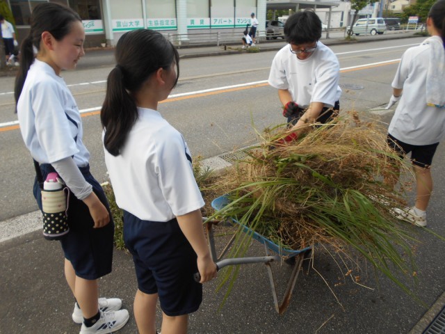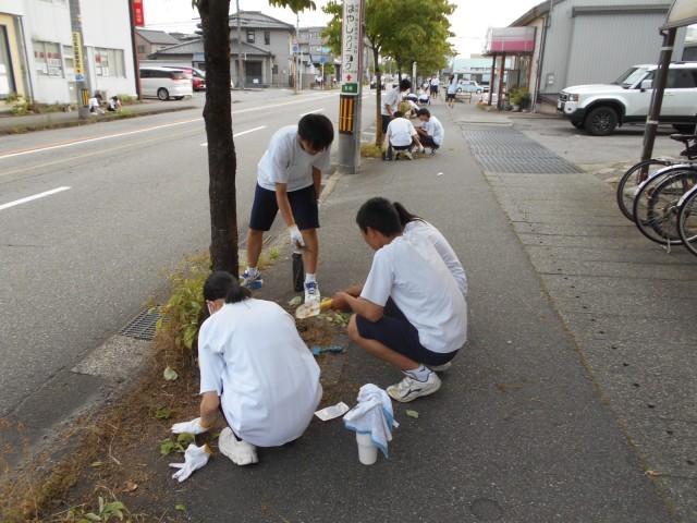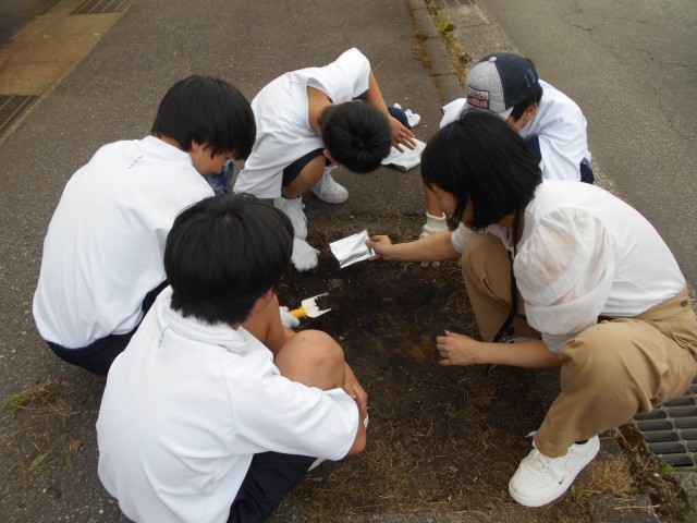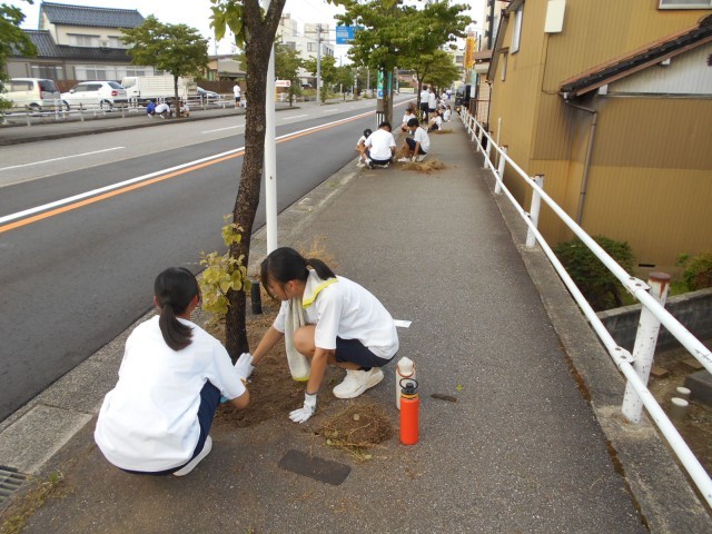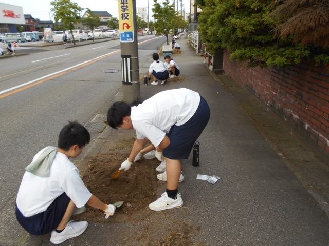 昨日放課後、生徒会主催のフラワーロード作戦を実施しました。学校周辺の街路樹の下に花を咲かせて、道行く地域の人々の目を和ませようとする活動です。30度を超える暑さでしたが、多くのボランティア参加の生徒が集まりました。学年・学級ごとに振り分けられた地点で、街路樹下の雑草を刈り、マリーゴールドなどの花の種をまきました。秋にはきれいなフラワーロードとなることを願います。