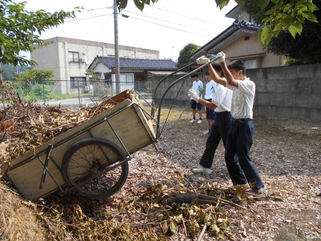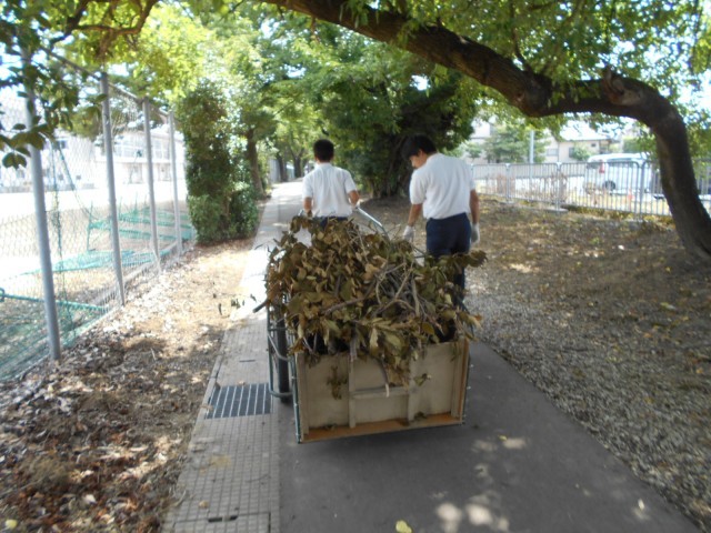 「社会に学ぶ『14歳の挑戦』」は2日目です。事業所が休業日のため、10数名が学校で活動しました。主に学校横の遊歩道の枯れ木を集めて、グラウンド奥のゴミ捨て場へ運びました。