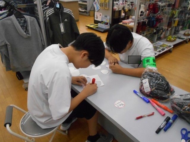 店員さんに教わりながら、グローブ等の商品につけるPOP作りをしています。