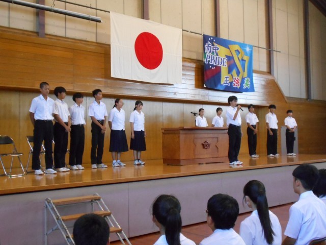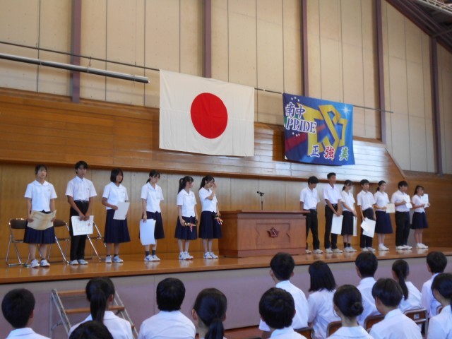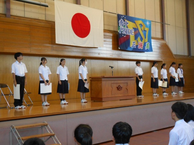 1学期の間に、部活動やクラブチームでの活動、習い事等で優秀な成績を収めた生徒の皆さんの受賞報告と夏休みに北信越大会や全国大会に出場する選手の壮行会を行いました。