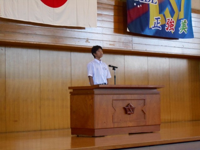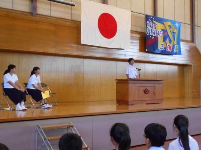 1学年の代表生徒は、学級代表や運動会の団責任者の経験を通して学んだ、行動に責任をもつことや仲間と一緒に頑張ることの大切さについて話し、2学期からの生活に生かしていきたいと発表しました。