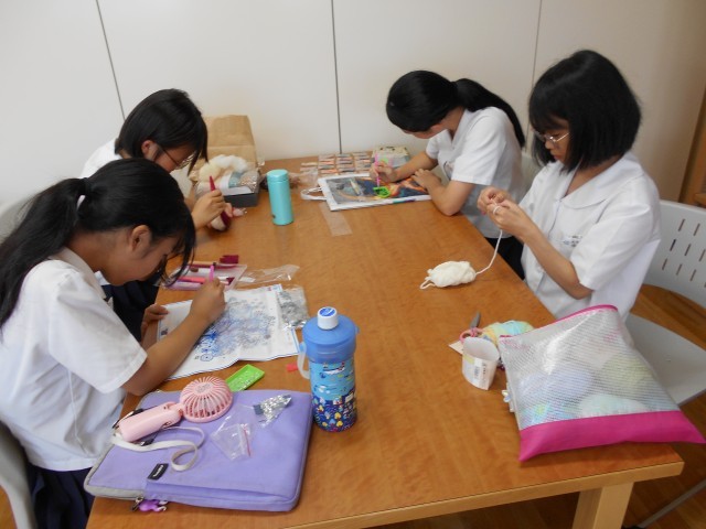 夏休みも8月に入りました。家庭・文芸部は、10月の富山県中文祭に展示する作品の制作をしていました。