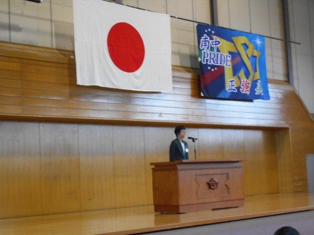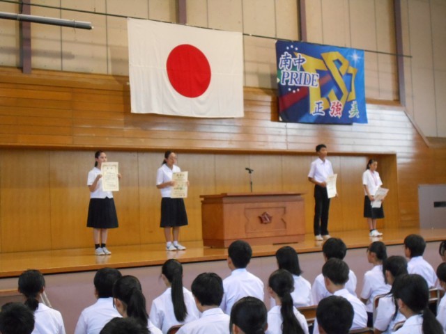 受賞報告では、夏休みの大会やコンクールでの南中生の活躍が報告されました。