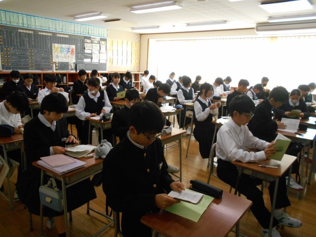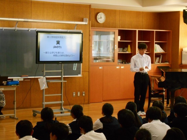 4限に学年集会を開き、後期学年生徒会のメンバーからの所信表明と、高岡校外学習のスローガンを発表しました。