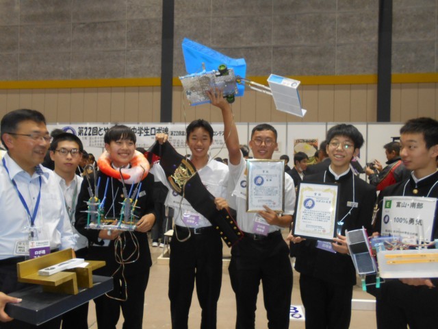11月1日、富山産業展示館で行われた県中学生ロボットコンテストに南中生3チームが出場しました。予選リーグを全チームが通過して決勝トーナメントへ進出。機材トラブル等でハラハラする場面もありましたが、チーム「MUK」がトーナメント優勝、そして、ロボコン大賞を勝ち取りました。3チームとも夏からコツコツと構想を練り、試行錯誤しながらチーム力を高めてきた成果です。