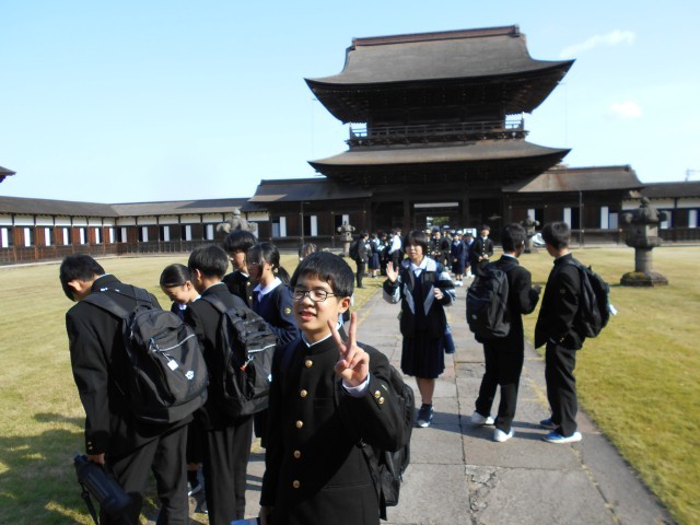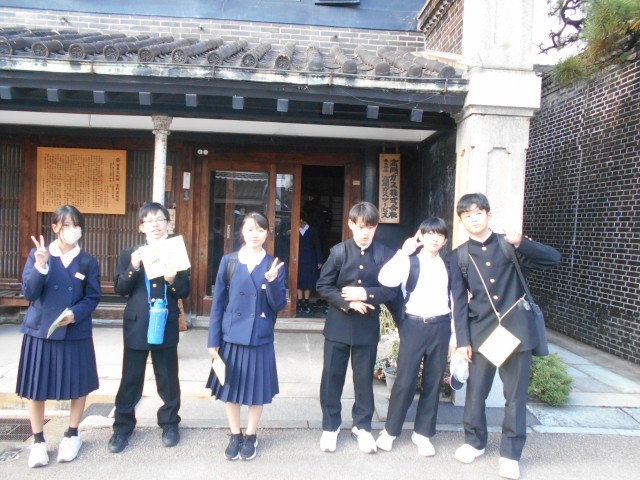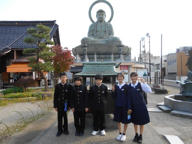 昼食後は、瑞龍寺に移動して集合写真を撮った後、班に分かれて高岡市内のフィールドワークに出かけました。「日本三大仏」の高岡大仏や、「千本格子のまちなみ」が有名な金屋町、「ドラえもん」の作者でおなじみの藤子・F・不二雄にまつわる資料が展示されている「ふるさとギャラリー」等、自分たちで考えたコースをめぐり、探索してきました。街中で見かけた生徒たちは、互いに地図を見合って行き先を相談したり、時計を見ながら声を掛け合ったりして、協力して活動を進めている姿が多くみられました。