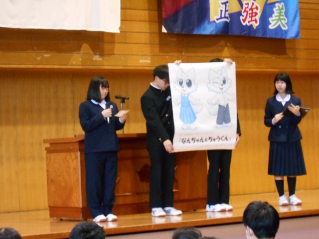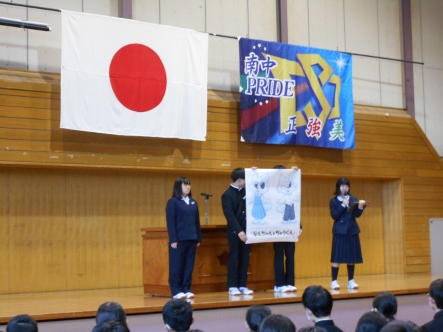 また、生徒会からマスコットキャラクター「なんちゃん&ちゅうくん」の発表がありました。これから生徒会の活動を伝える場面で登場するそうです。今後も「なんちゃん&ちゅうくん」と共に南中生の活躍がたくさんみられるといいですね。