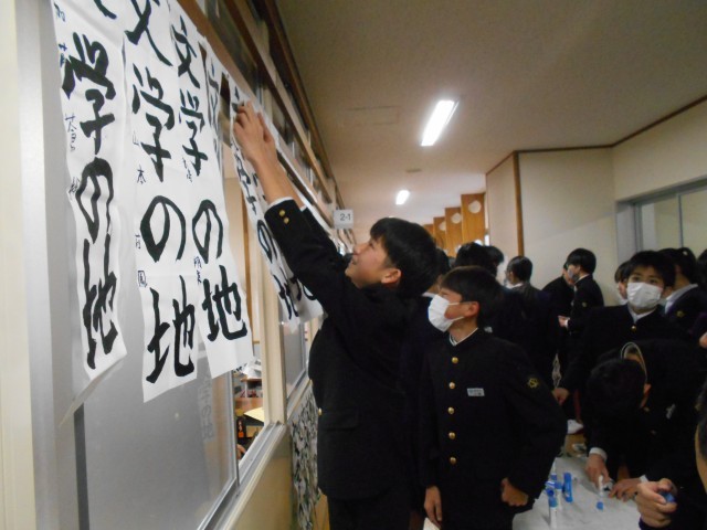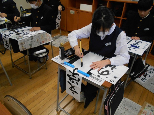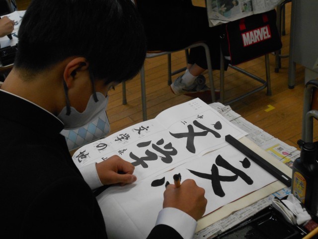 静かな集中した雰囲気の中、真剣な表情でそれぞれが筆を運んでいました。2年生は、行書で「文学の地」の文字を書き、それぞれの個性と努力が感じられる素晴らしい作品が誕生しました。