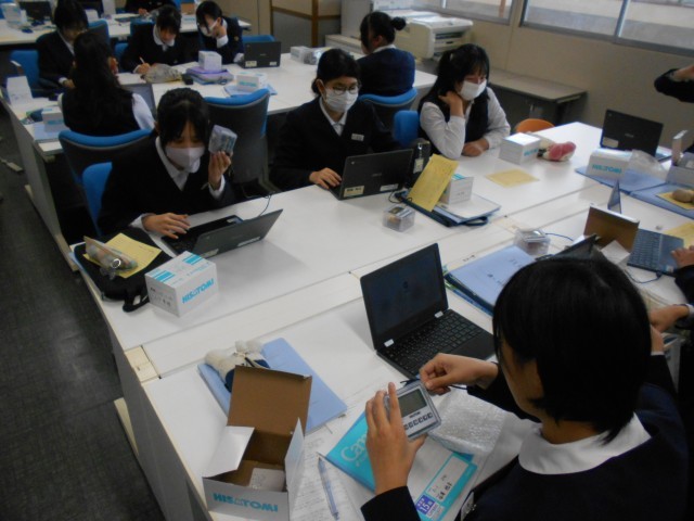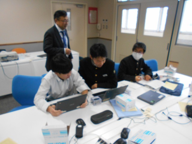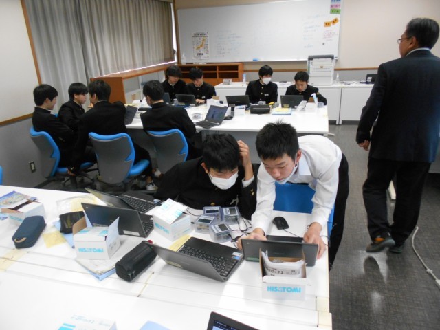 技術では、班で協力して、LED点灯のプログラミングをしています。