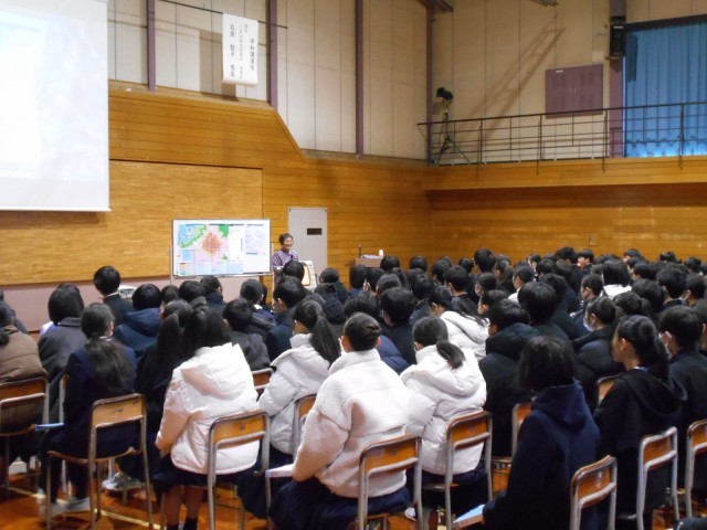 広島被爆者援護会から語り部さんをお招きして、平和学習を行いました。胎内被ばくをされた語り部さんが、母親から聞いた体験談や南中生への熱いメッセージをたくさんいただきました。5月の修学旅行先、広島での学びへと繋いでいきます。