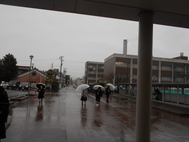 雨の朝です。傘の雫を落としてから玄関に入ります。