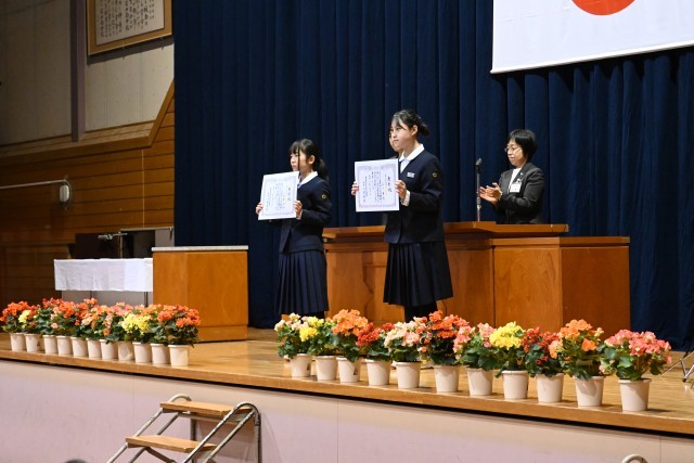 3年間スポーツや文化的活動で活躍した生徒に表彰状が授与されました。また、3学期に書き初め等で頑張った3年生の受賞報告が行われました。3年生の皆さん、3年間よくがんばりました。中学校での頑張りを土台に、卒業後の活躍を祈っています。