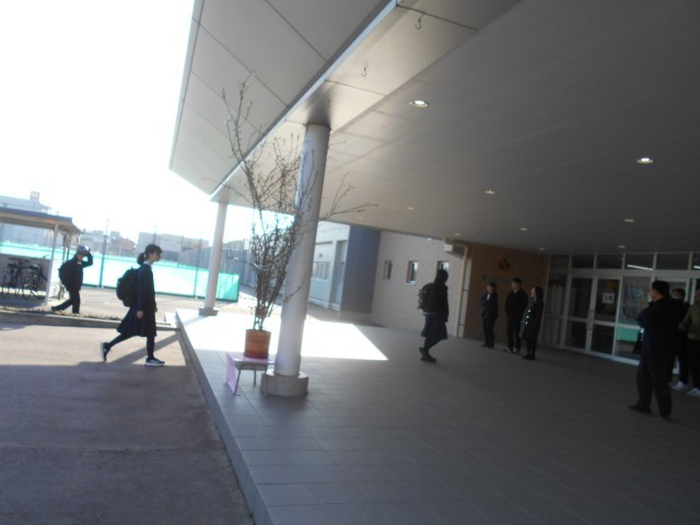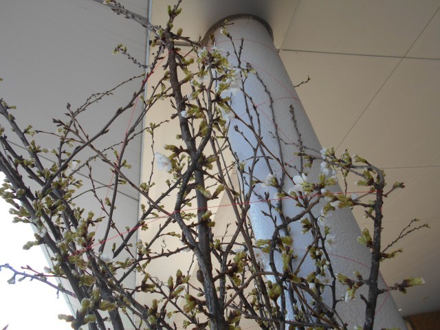 青空の朝です。建物に接触していた桜の枝を整えてもらったときの枝から、桜の花が咲き始めていました。