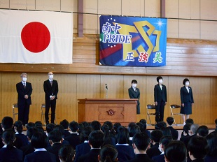 進級した新2、3年生が体育館に集い、離任式を行いました。3月末の異動で、中村諭教頭先生、中島悠先生、野尻裕美先生、横山絵里子先生、大門弘子先生、事務の筒口孝雄さん、ALTのロペズ,レイシェル・アン先生が離任されました。南部中学校で過ごした思い出とともに、これから南中を担っていく生徒たちに向けた激励の言葉も語ってくださいました。生徒たちは、真剣にお話に耳を傾け、しっかりとメッセージを受け止めていた様子でした。