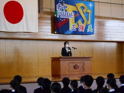 始業式では、校長先生から、コロナ禍でもできることを工夫しながら行事を実現していくこと、組織の再編を経て新しくスタートする生徒会活動を充実させていくことについてお話がありました。また、3年生には「南中の最高学年として、目標を決めて粘り強く取り組む姿を1,2年生に見せてほしい」、2年生には「3年生の姿を見て、1年生に『南中プライド』をつなぐ大きな役割を果たしてほしい」と、それぞれに向けた「願い」が語られました。
