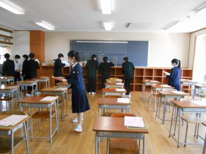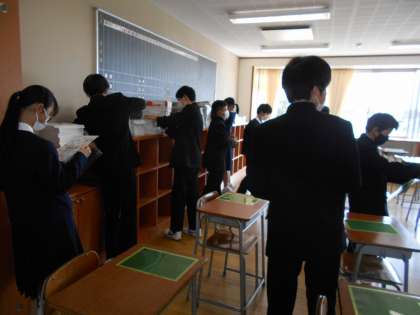 明日の入学式に向けて、1年生の教室では、教科書や配布資料を一人一人の机上にセットしました。役割分担して、数に間違いのないように進めてくれました。