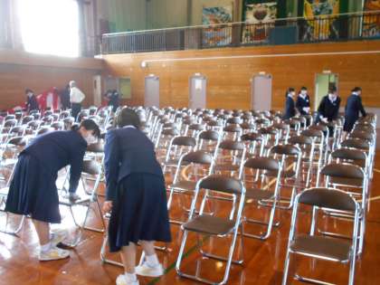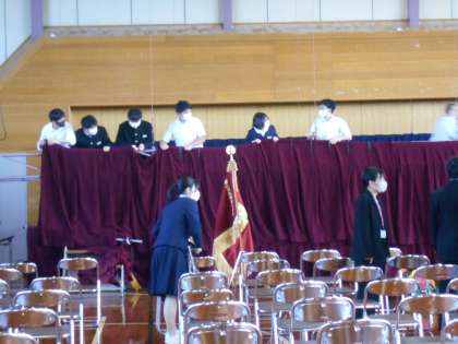 体育館でも、3年生が準備をしてくれました。椅子を等間隔で並べる人、椅子を雑巾で丁寧に拭く人、幕をつる人、紅白幕を張る人。一人一人の仕事を一生懸命取り組んでいる姿は、とても立派でした。明日からの最上級生としての取組が楽しみです。