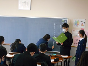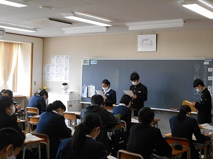 本日1限に、学級討議を行いました。15日(金)に行った第1回生徒議会・専門委員会を受けて、各クラスの代議員や専門委員が、活動の目的や内容等を説明しました。前に出て、クラス全員に向けて発表することは緊張したと思いますが、それぞれが責任をもって取り組んでいました。今後、クラスで出た意見をもとに、さらに内容が錬られていきます。「生徒みんなでつくる生徒会」を目指して、よりよい活動になることを願っています。