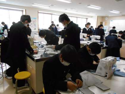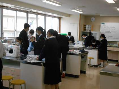 家庭科の授業では、自分で使いたいと思えるエコバックを作り上げるということで、丁寧に手順を確認しながら、アイロンがけやミシン縫いを進めていました。