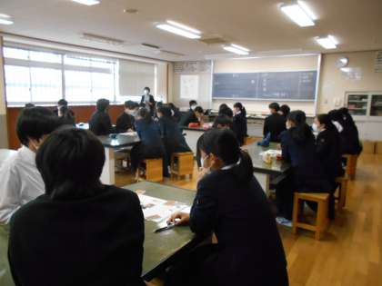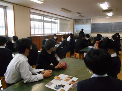美術の授業では、色々なイラストや絵画を見て、色や形、線によってどんなことを表現していると感じたか、意見を出し合っていました。